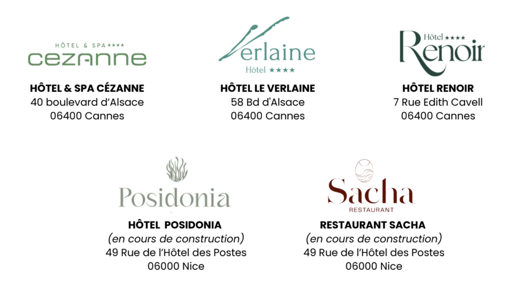 The group has announced the acquisition of three iconic hotels in Cannes, ideally located near the Croisette and the Rue d’Antibes: the Hotel Verlaine**** ( 46 rooms) , the Hotel & Spa Cézanne **** (29 rooms) and the Hotel Renoir**** (31 rooms) .